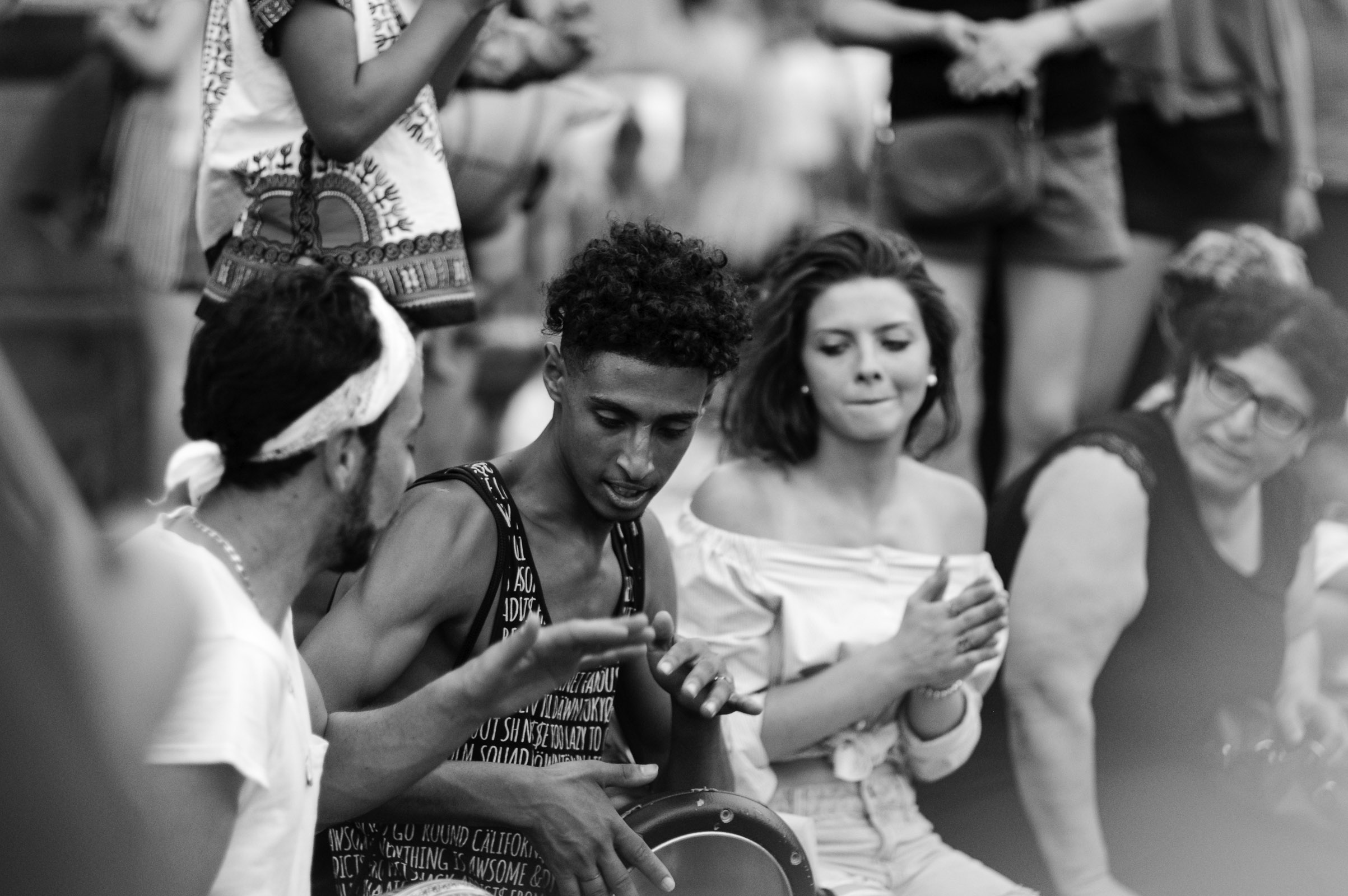 Rien de tel qu’une grande ouverture (ici f1.4) pour isoler un sujet. Ici j’ai voulu mettre en valeur l’un des percussionnistes qui tapaient le bœuf sur la Place de la République lors de la fête de la musique de 2017. La faible profondeur de champ tend à effacer les relations entre les personnages de la photo et vous laisse les imaginer.
